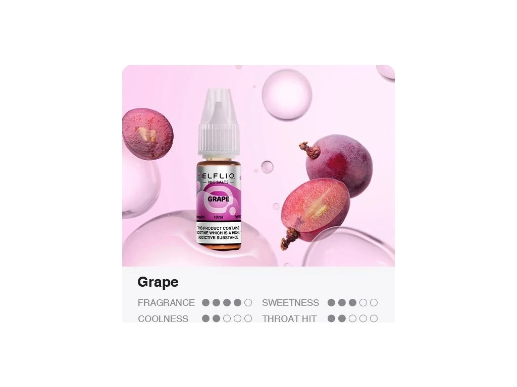 Chuť čerstvých hroznů se sladkokyselou dochutí. Společnost Elf Bar je ve světě vapingu opravdovým fenoménem dnešní doby. Jejich jednorázové elektronické cigarety si našly miliony příznivců po celém světě, a to díky jejich nezapomenutelné a jedinečné chuti liquidu. Nyní si pro svoje fanoušky Elf Bar přichystal i samotný liquid ELFLIQ Nic SALT, který se od běžných liquidů odlišují tím, že má nižší PH a obsahuje nikotinovou sůl, díky které dochází k rychlejší a kvalitnější vstřebatelnosti = bez dráždivého pocitu v krku oproti klasickým liquidům. Vyvážený poměr 50VG/50PG je vhodný do všech typů elektronických cigaret.