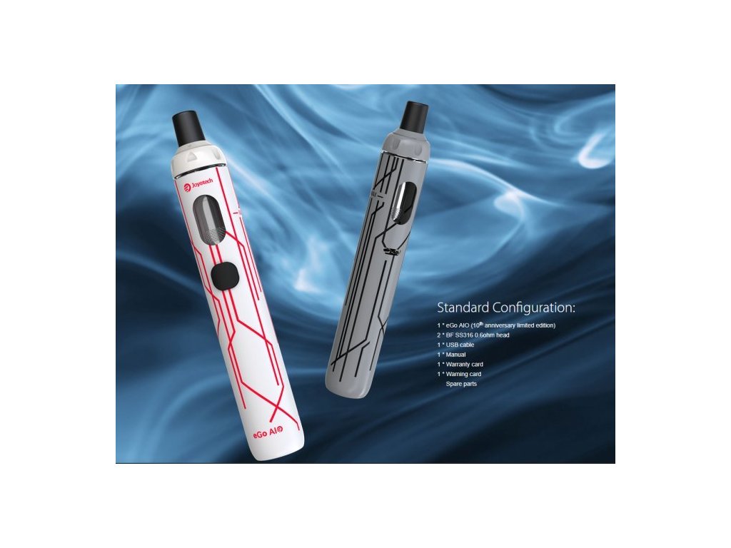 Limitovaná edice k 10-ti letému výročí společnosti Joyetech. Při této výjimečné události přichází výrobce s nejoblíbenější a nejprodávanější elektronickou cigaretou na světě eGo AIO ve speciálním barevném provedení. Moderní a designové tělo e-cigarety skrývá vestavěnou baterii o kapacitě 1500mAh. Styl ALL in ONE uspokojí jak úplné začátečníky, tak i zkušené uživatele, kteří si chtějí prožít vaping bez jakéhokoli nastavování (výkon je nastavován automaticky v závislosti na zvoleném odporu atomizeru). Vrchní odnímatelná část je opatřena dětskou pojistkou = ochrana před nechtěným otevřením. Atomizer se tradičně nachází pod náustkem, kde je i regulace přívodu vzduchu. Atomizery Joyetech BF výrobce ponechal i pro tuto vzácnou edici. Vnitřní část náustku je spirálovitého tvaru = ochrana proti případnému prskání liquidu do úst (ocení začátečníci). Clearomizer je podsvícen LED diodami. Při zamčené baterii dlouhým stiskem spínače si můžete vybrat barvu podsvícení clearomizeru (červené, žluté, zelené, modré, indigo, bílé a fialové). Nabíjení umožňuje micro USB vstup (e-cigaretu lze používat i při nabíjení).