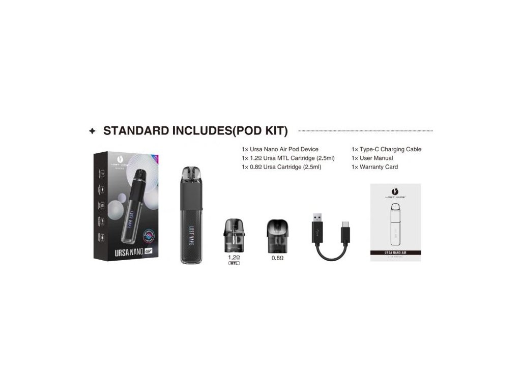 Lost Vape Ursa Nano AIR Pod je elegantní elektronická cigareta s hladkým povrchem, decentním designem a důmyslným přívodem vzduchu pro čistý MTL vaping. Vestavěný monočlánek o kapacitě 800mAh disponuje automatickým výkonem až 16W, USB-C portem pro rychlé nabíjení a automatickým spínačem. Vyměnitelné cartridge o objemu 2,5ml jsou plně kompatibilní s předchozími modely cartridgí Ursa Nano. Výrobce si pro tento model připravil novinku Ursa MTL cartridge s vestavěnou žhavicí hlavou o odporu 1,2ohm.