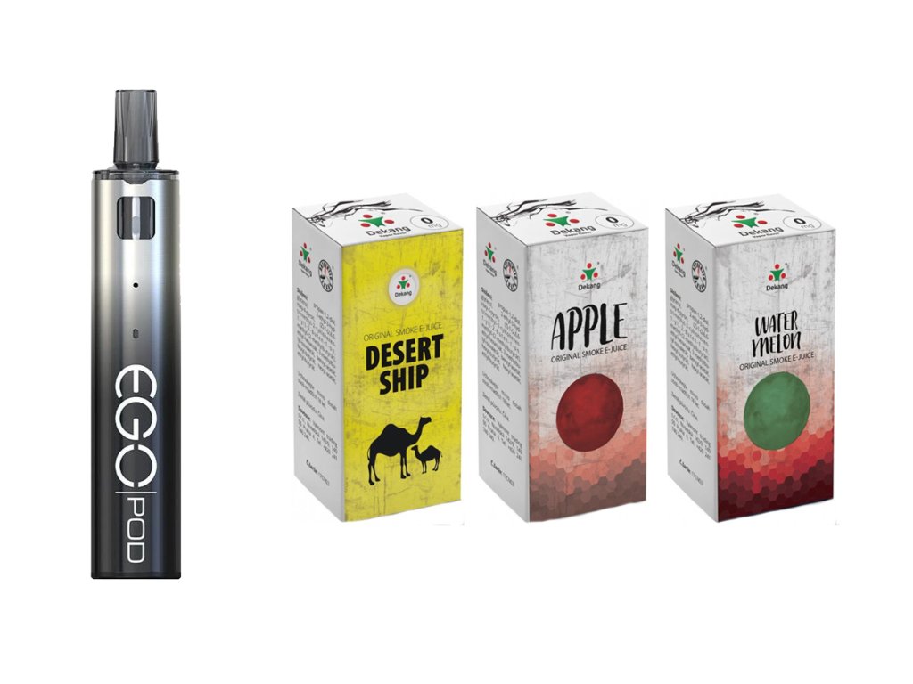 - 3x e-liquid Dekang (10 ml) – Vysoce kvalitní náplně bez nikotinu nebo s klasickým nikotinem (0, 3, 6, 12 nebo 18 mg) s tabákovými nebo ovocnými příchutěmi.