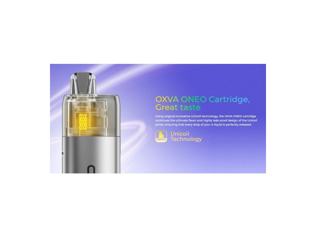 OXVA ONEO je elegantní a výkonná elektronická cigareta s Pod systémem, která je navíc vybavena postraním RGB světelným panelem. Kompaktní tělo baterie obsahuje vestavěný monočlánek o kapacitě 1600mAh, light indikátor stavu nabití, automatický výkon až 40W, rychlé nabíjení pomocí USB-C portu a inovativní regulaci přívodu vzduchu AFC pro MTL a DL vapování. Cartridge o objemu 3,5ml disponují vestavěnou žhavicí hlavou s technologií Unicoil - špičková chuť liquidu.