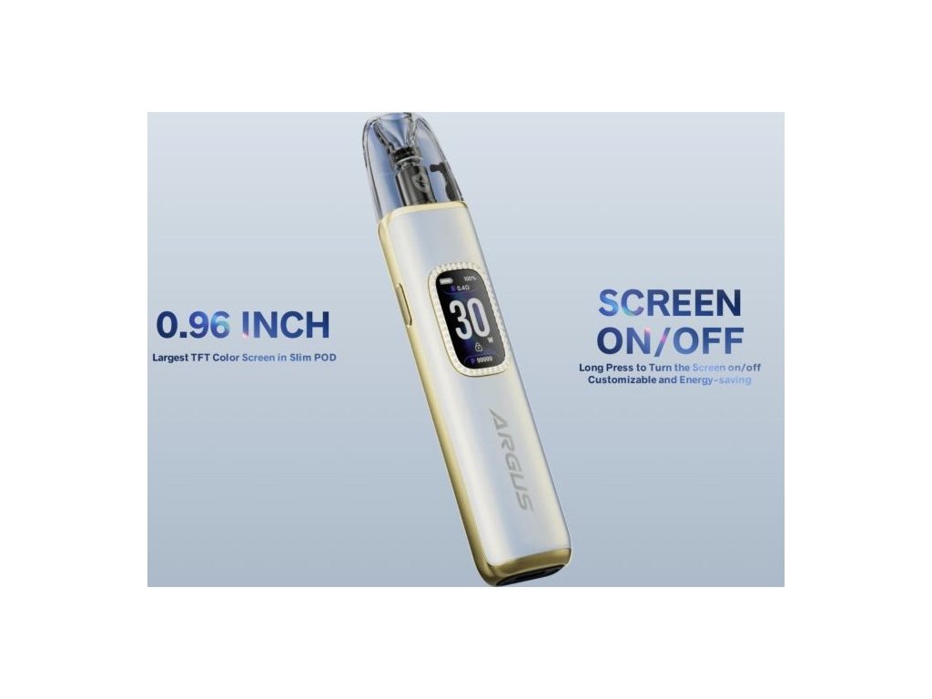 Barevný 0,96″ TFT displej nabízí 3 motivy a 2 animace pro maximální přehled a styl. Regulace výkonu v rozmezí 5–30 W a kompatibilita s cartridgemi Argus Top Fill V2 umožňuje vapovat přesně podle vašich preferencí – od utaženého MTL po volnější RDL potah.