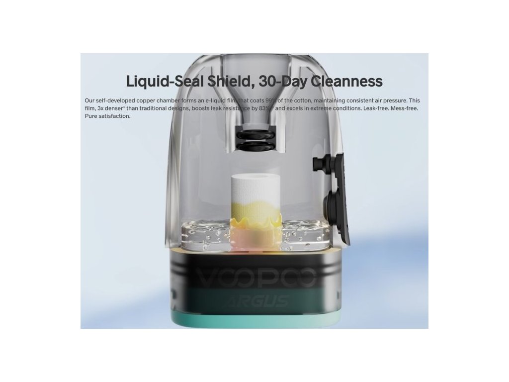 Srdcem zařízení je cartridge Argus Top Fill V2 (0,7 Ω) s objemem 3 ml, vybavená technologií iCOSM CODE 2.0, která zajišťuje konzistentní chuť až po dobu 30 dní a umožní využít až 100 ml e-liquidu bez přepalů. Plnění shora (top-fill) je rychlé a bez nepořádku.