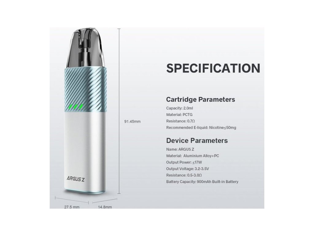 ARGUS Z je kompaktní a lehká elektronická cigareta z dílny VOOPOO, která je navržená pro příjemný zážitek z vapingu. Vestavěná baterie o kapacitě 900mAh má dostatek energie na to, aby vystačila pro celodenní vapování. Vyměnitelnou cartridge (POD) o objemu 2ml pohodlně naplníte díky jednoduchému bočnímu plnění. Na výběr máte mezi cartridgemi s vestavěnou žhavicí hlavou nebo cartridgií s vyměnitelnou žhavící hlavou ITO-M. Cartridge disponuje 4-otvorovým spodním přívodem vzduchu a společně s důmyslnou regulací přívodu vzduchu zajišťuje skvělou dýmivost a autentickou chuť liquidu.